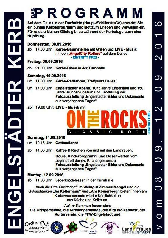 Von Mai bis September veranstalten die Engelstädter Winzer "jeden 1. Mittwoch im Monat" einen Weintreff auf unserem neu gestalteten Dorplatz. Die Engelstädter Winzer freuen sich auf Ihren Besuch![mehr] |