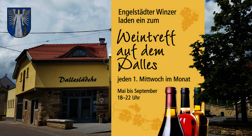Von Mai bis September veranstalten die Engelstädter Winzer "jeden 1. Mittwoch im Monat" einen Weintreff auf unserem neu gestalteten Dorplatz. Die Engelstädter Winzer freuen sich auf Ihren Besuch![mehr] |